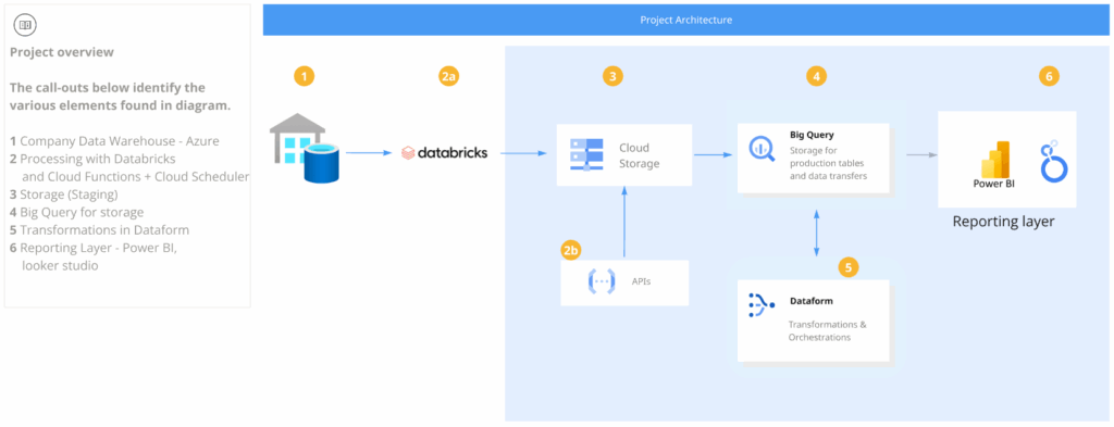 - Processing Layer – Databricks & Cloud Functions – collects and processes external API data.