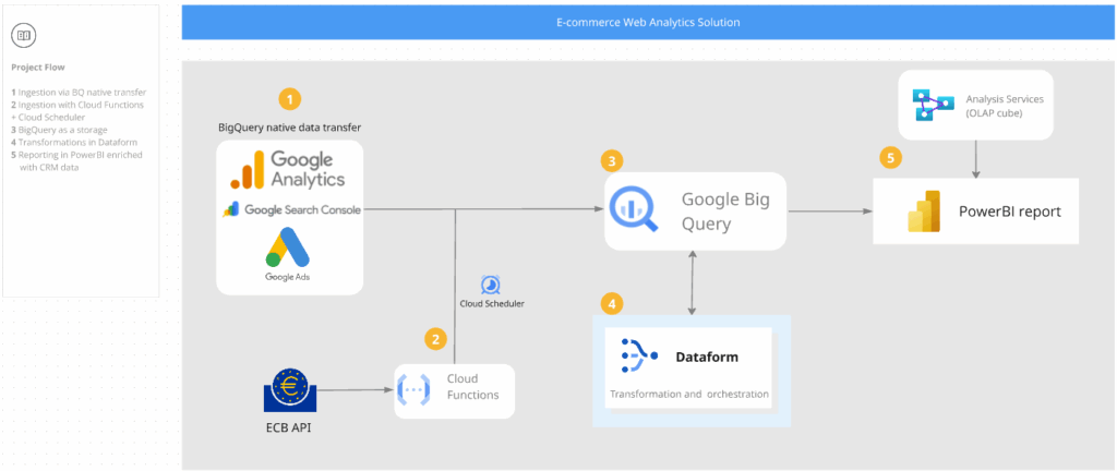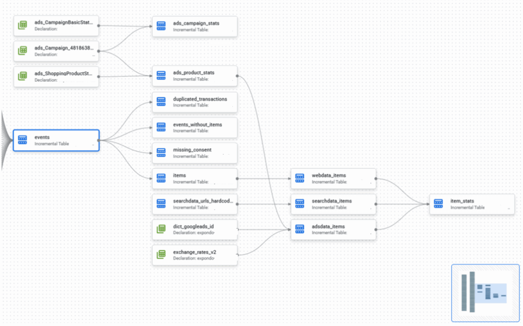 - Dataform: Data modeling, orchestration, and incremental loads; custom scopes for events, items, and content grouping.