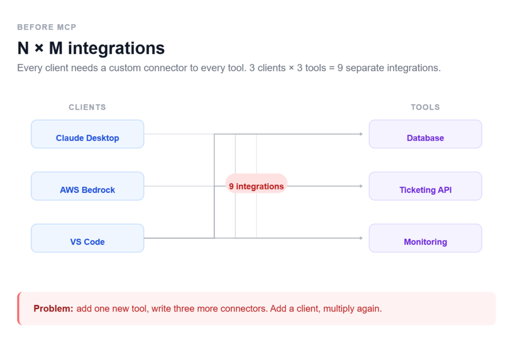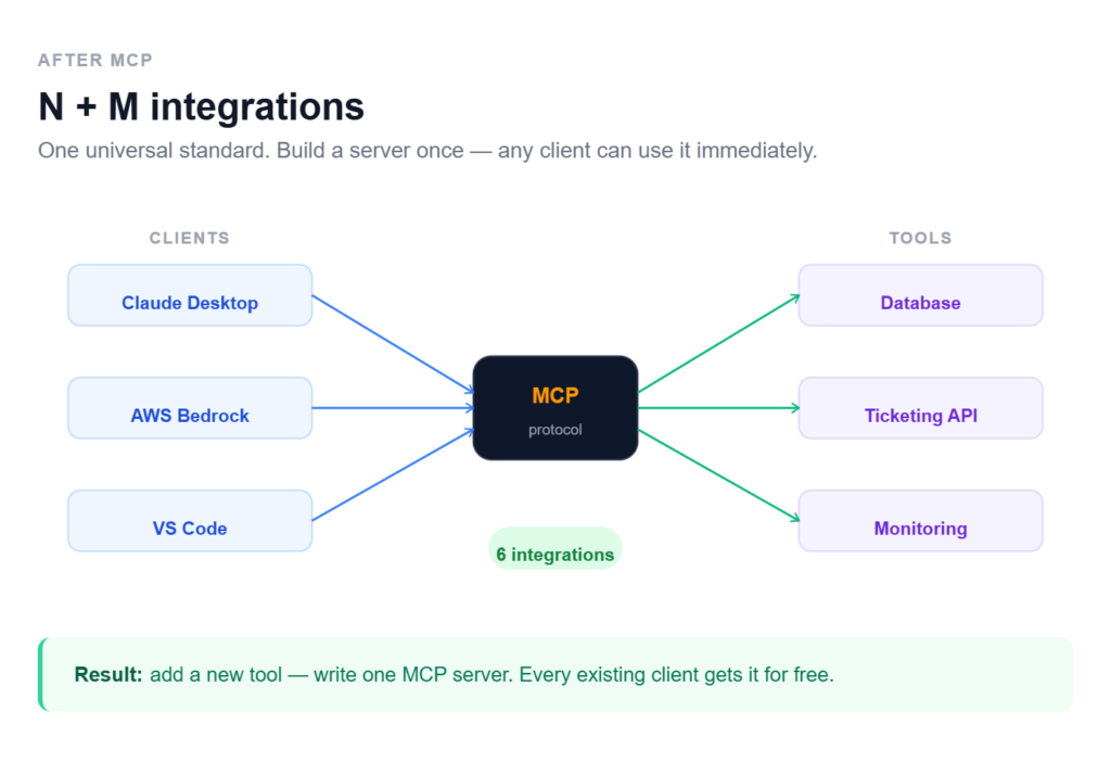 The core shift is from N×M (every client × every tool = a separate integration) to N+M (every client + every tool connects through a shared protocol). For an architect, that means dramatically simpler systems and the ability to compose battle-tested components instead of reinventing the wheel each time.