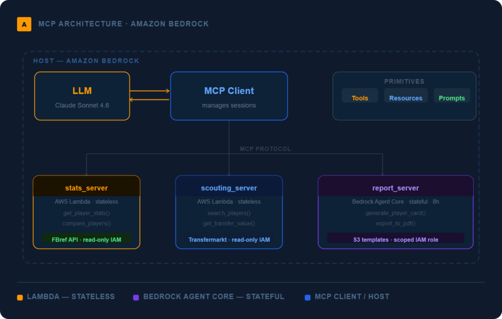 • Host — the main AI application (e.g. Amazon Bedrock). This is where the LLM lives.