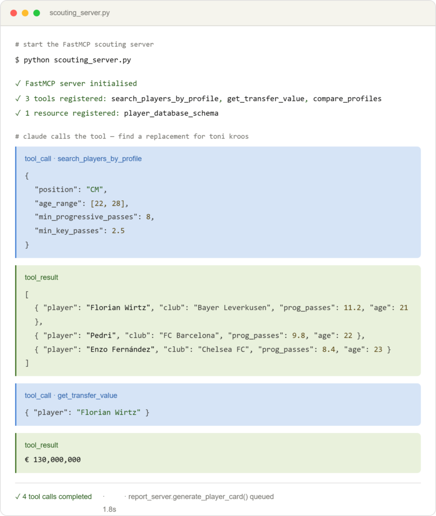 Theory is one thing, but I learn best through examples from my own domain. I’m a football fan and an amateur stats enthusiast — so the natural question was: how would I use FastMCP to build a real analytical tool?