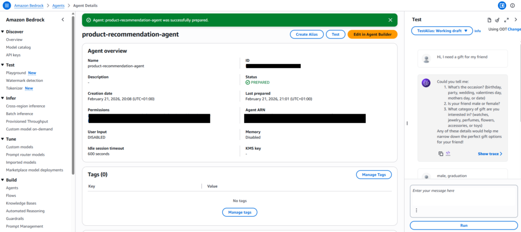 The starting point was creating an agent in the Bedrock console, selecting Claude Sonnet 4.5 as the model, and writing the system prompt — the instructions that define the agent’s role and boundaries. One of the key lessons: don’t rush, and read carefully. A vague prompt produces a vague agent. Precise instructions about when to call a tool, how to handle missing parameters, and what never to reveal to the user — that’s what separates a good agent from a frustrating one.